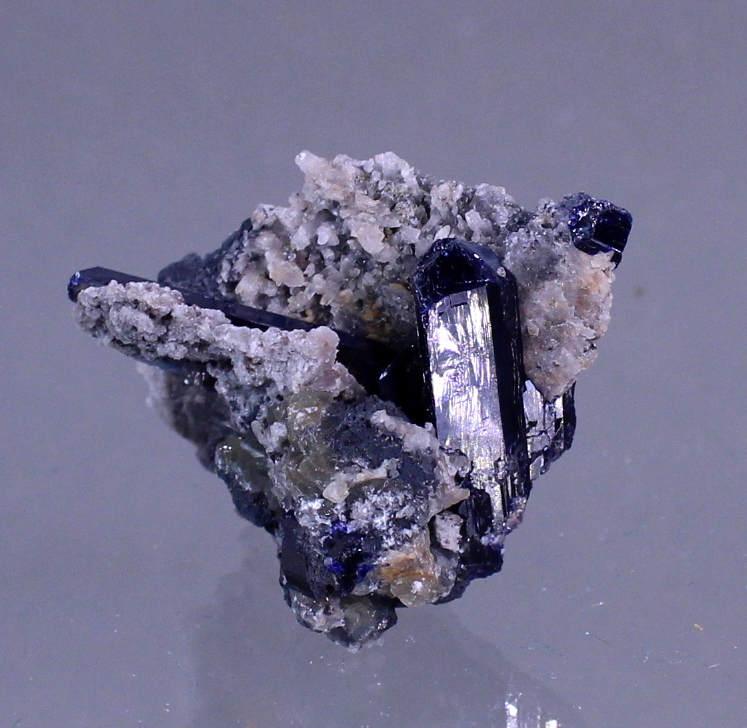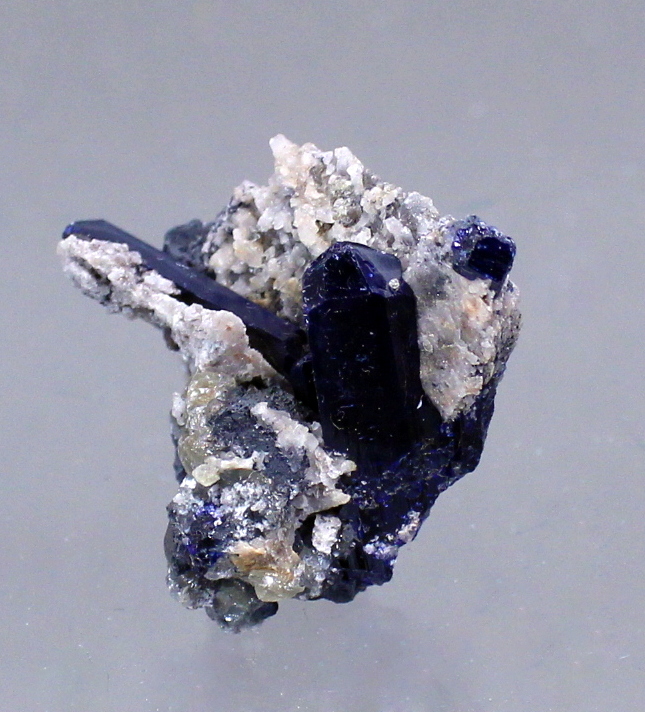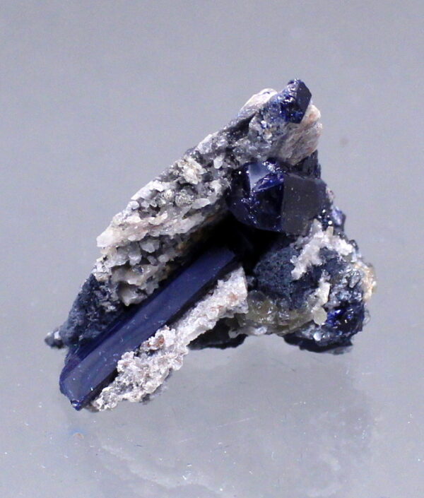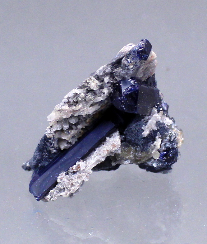 Dating back to the 1956-57 time period, this specimen came to light while work was being completed on the DeWet shaft. Mining had reached around the 20th level. The Azurites predominantly came from the first oxidation zone around the 7-10 level. This specimen formed in some brescia with a 2.2cm upright complete crystal and a 2.5cm elongated crystal in the seam (not terminated on one end). Crude Cerussites accompany the Azurites. Ex Ben Chomiak.