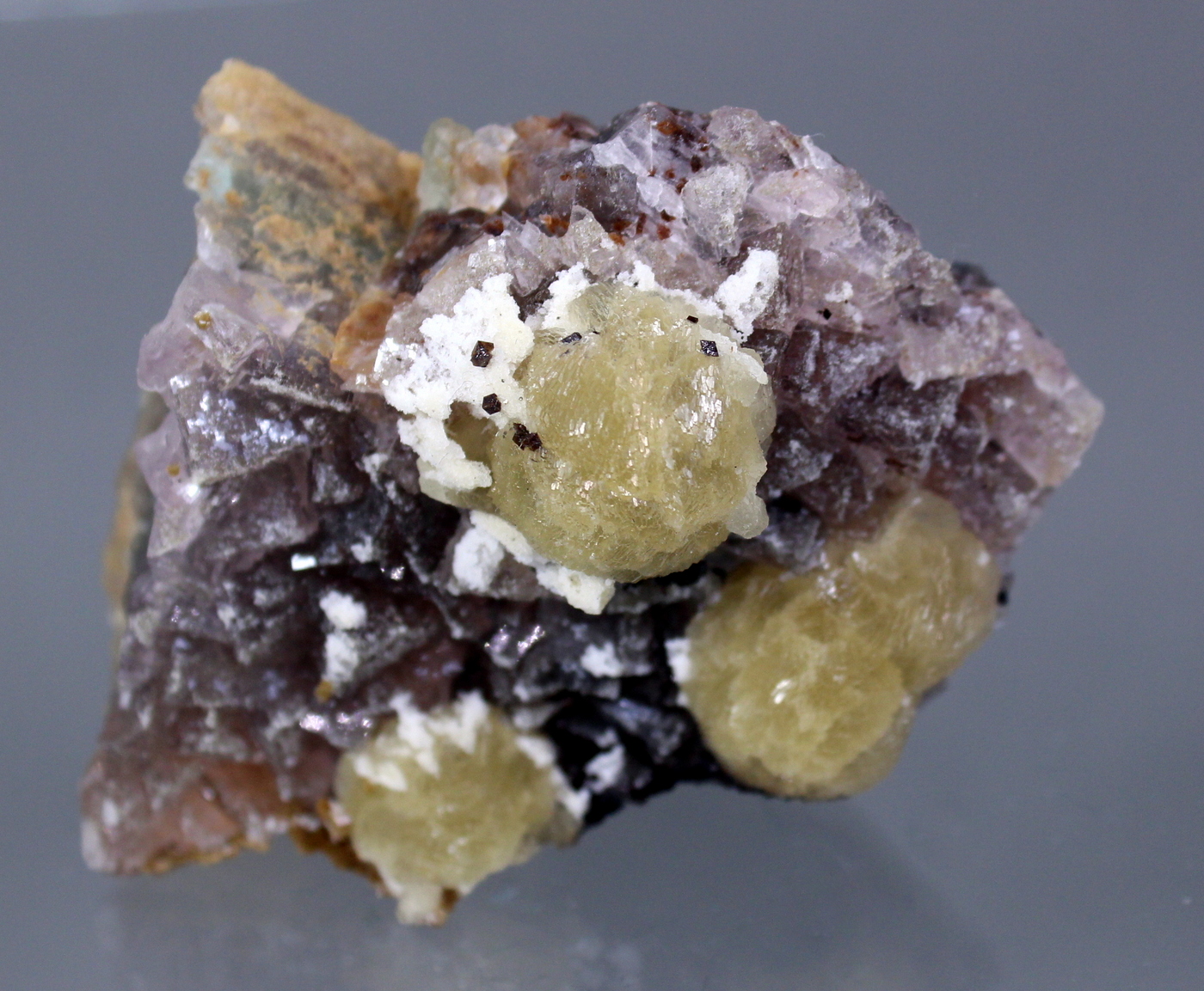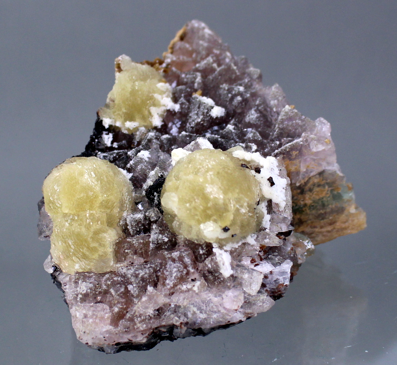 These came out about a year ago and were first thought to be spherical fluorites. Instead, the yellow spheres are calcite and they rest on a crystalized fluorite bed which are surficially coated by micro quartz. Brown to tan siderites later formed and are mostly concentrated around the largest calcite sphere. Unusual and attractive!