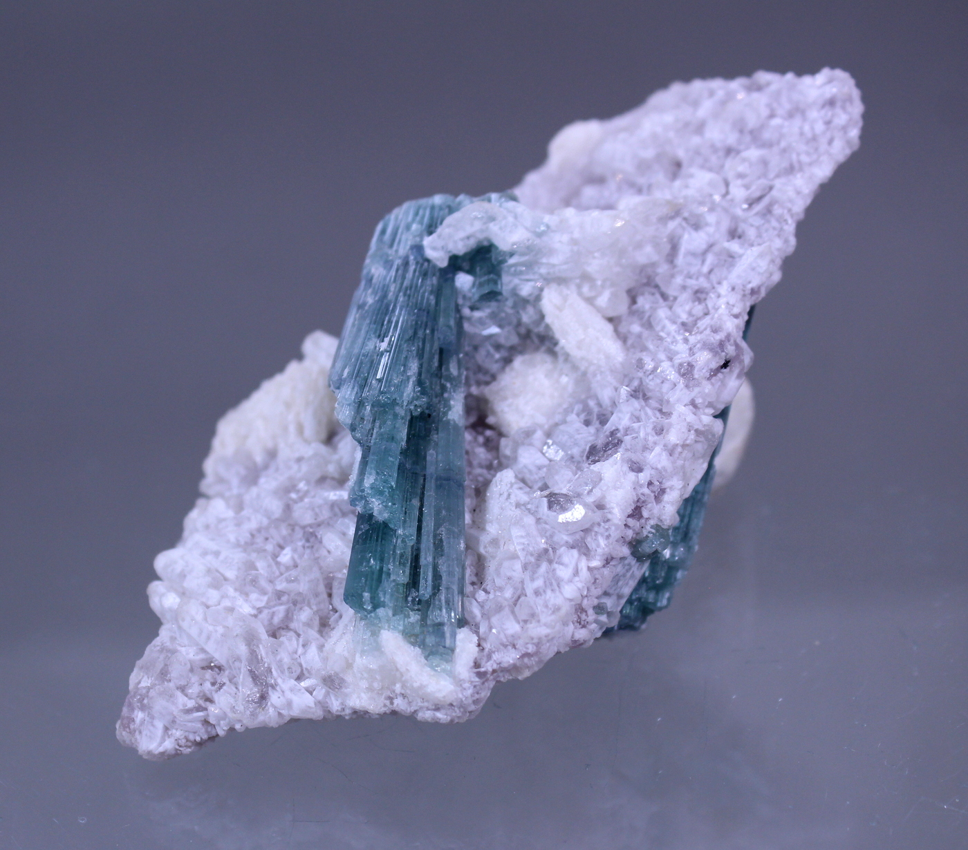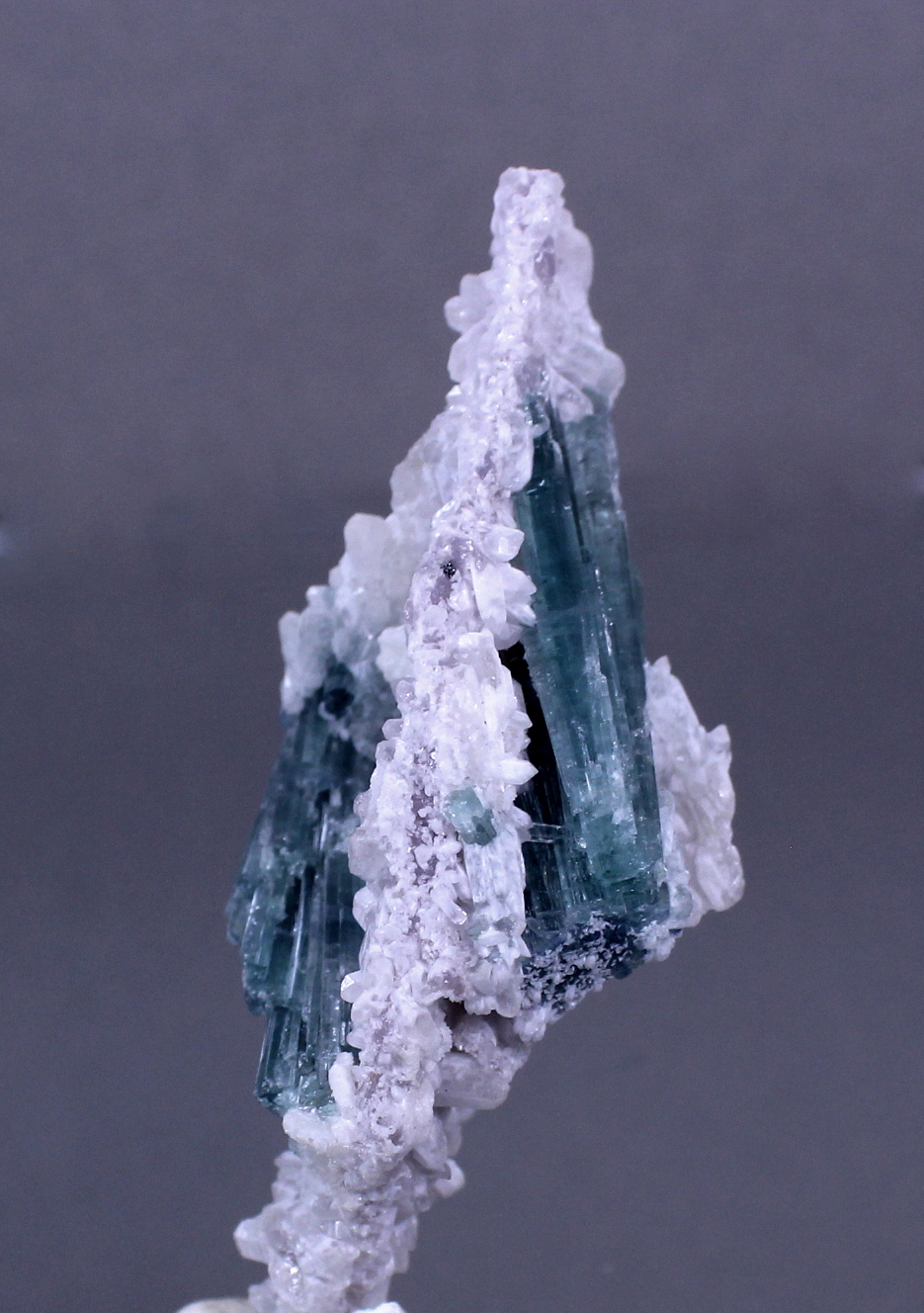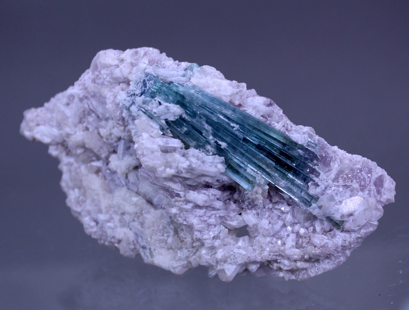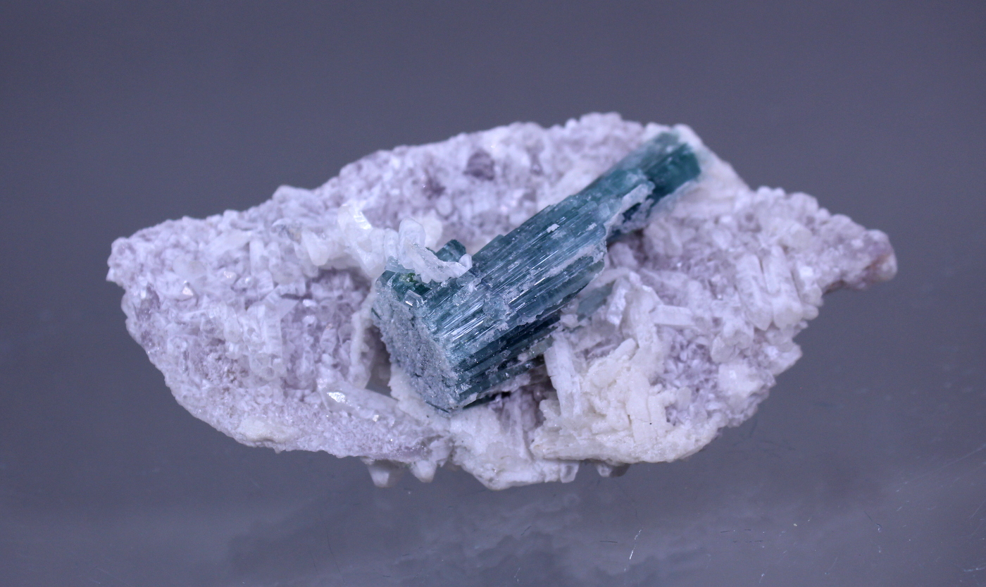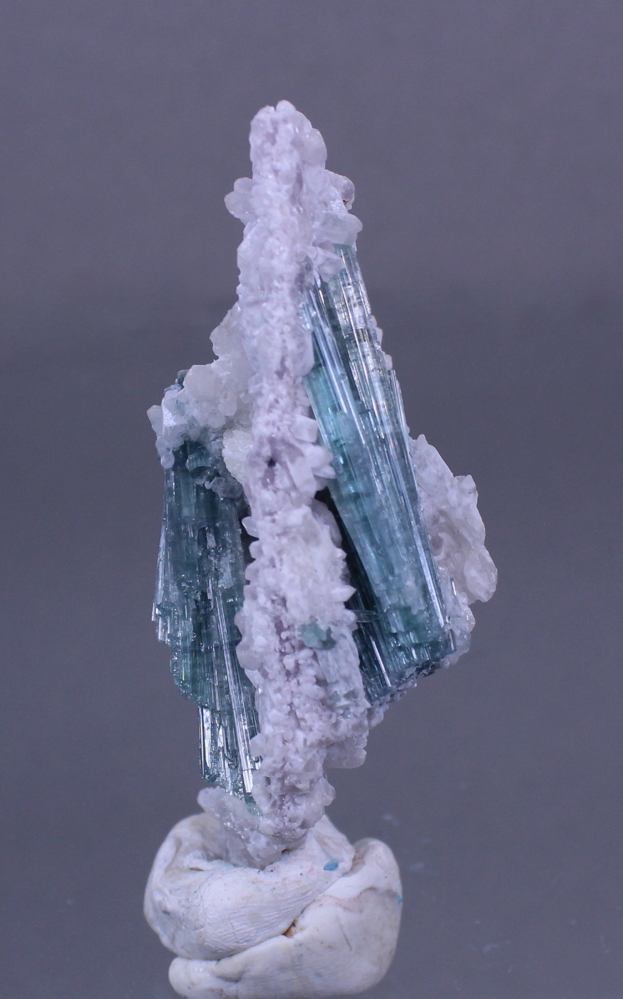 A remarkable two sided specimen with complete crystals. The blueish Elbaite sprays reach 5cm and are mostly gemmy. The bed of small quartz crystals have a lilac tint that hints at lithium enrichment. Display either side or stand it up for a 360!