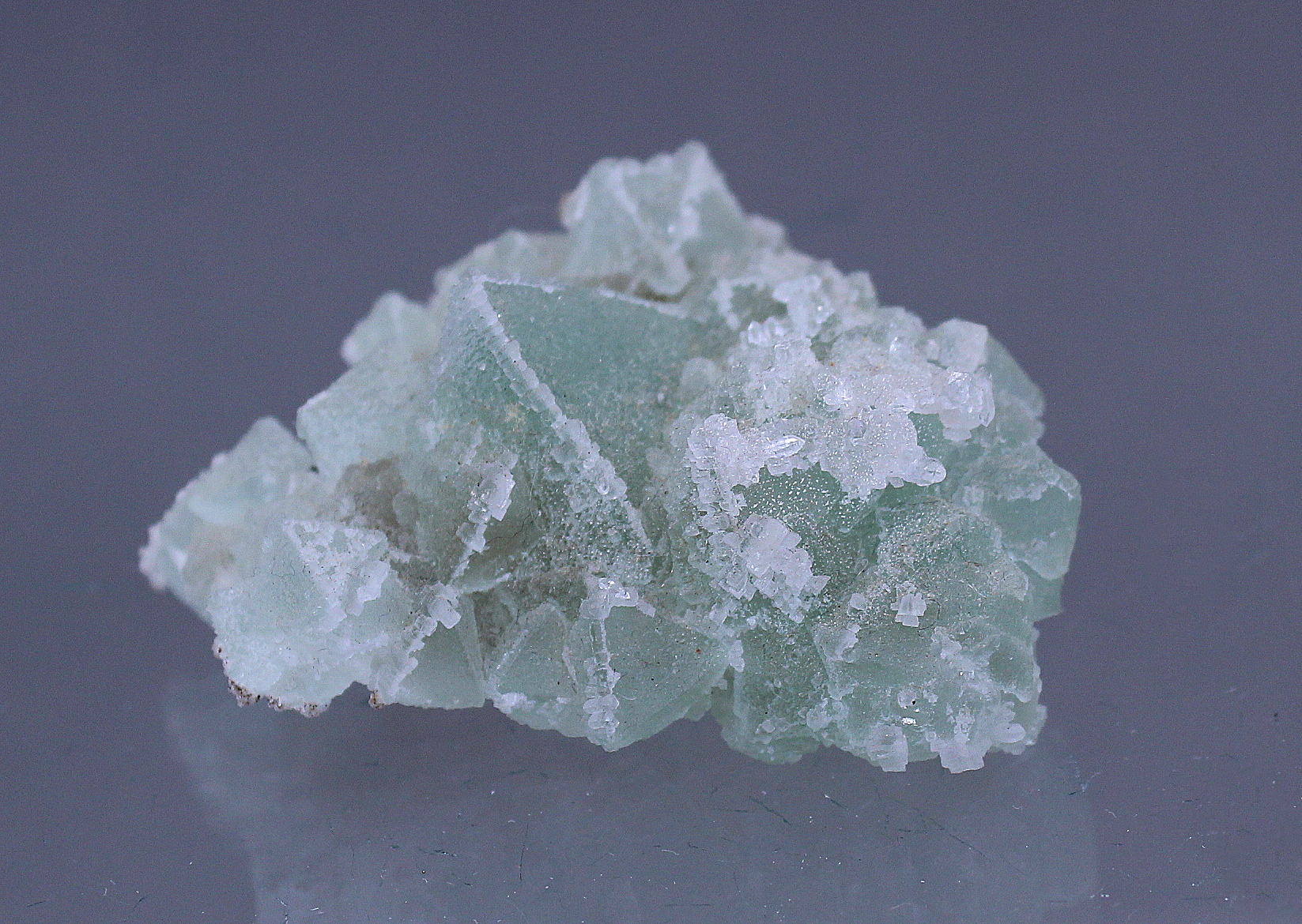 A pale green assemblage of pyramidal frosty Fluorites. The central crystal is 2.5cm. These were the hit of the 2001 Tucson show and are now scarce in the market.