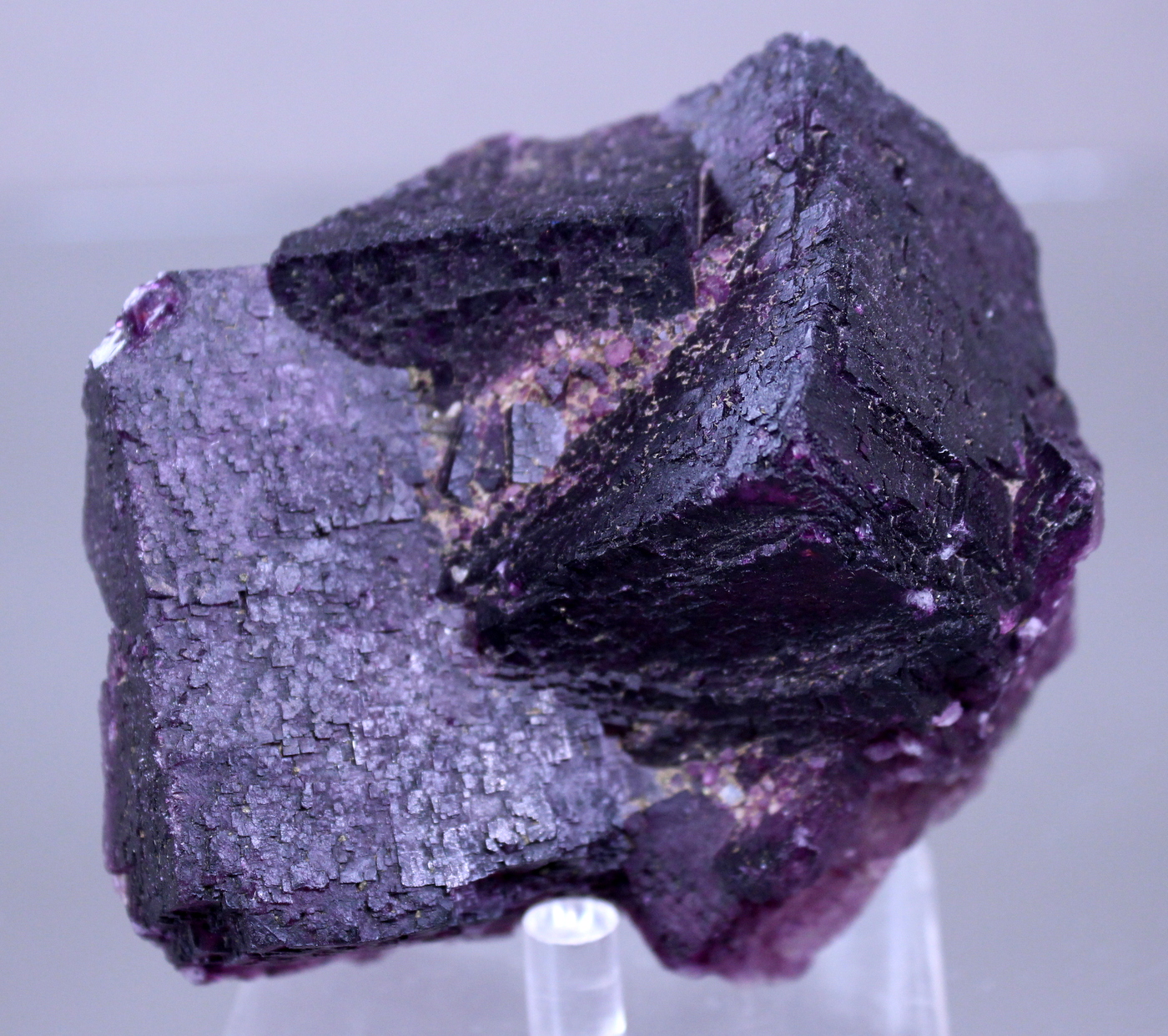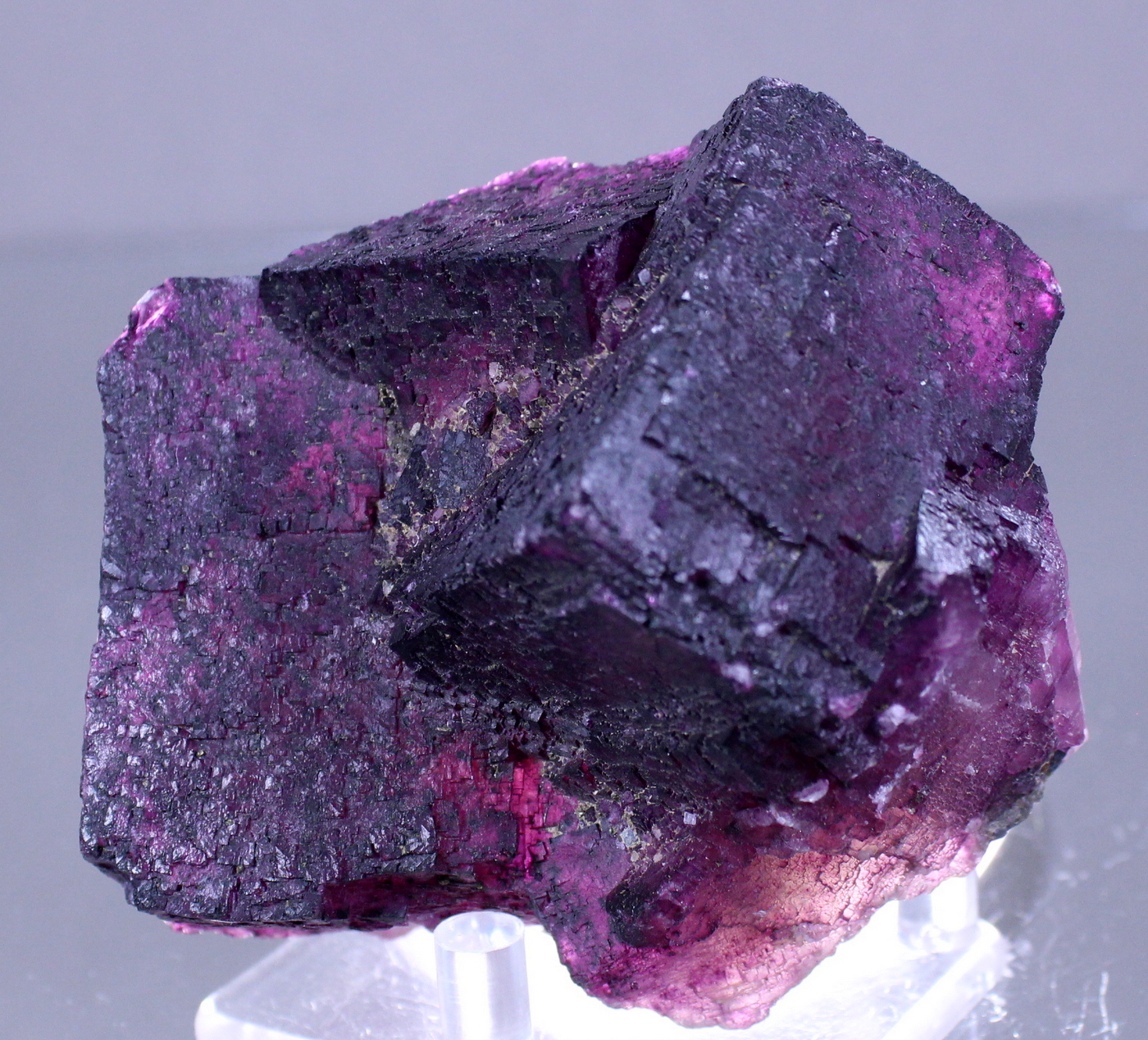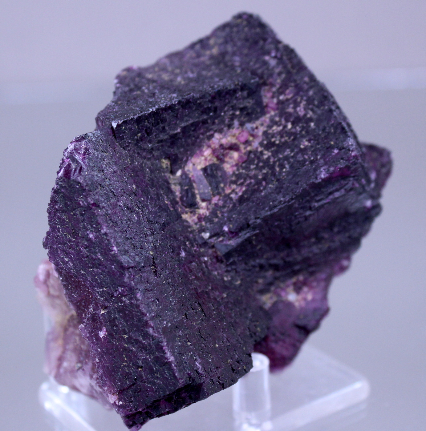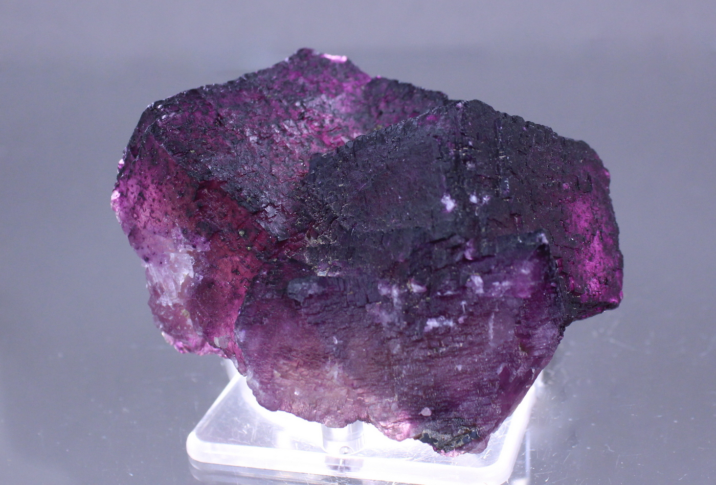 A near floater with the only blemish at the very top left corner of the main photo. The conjoined cubes provide a dramatic display. With some light added the piece is entirely translucent grape jelly.