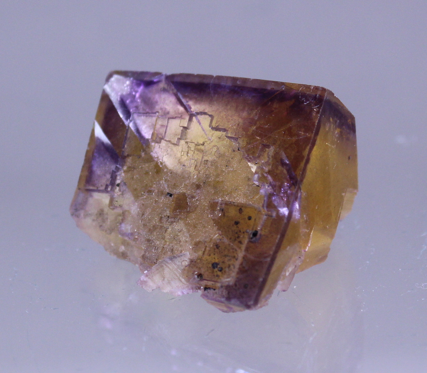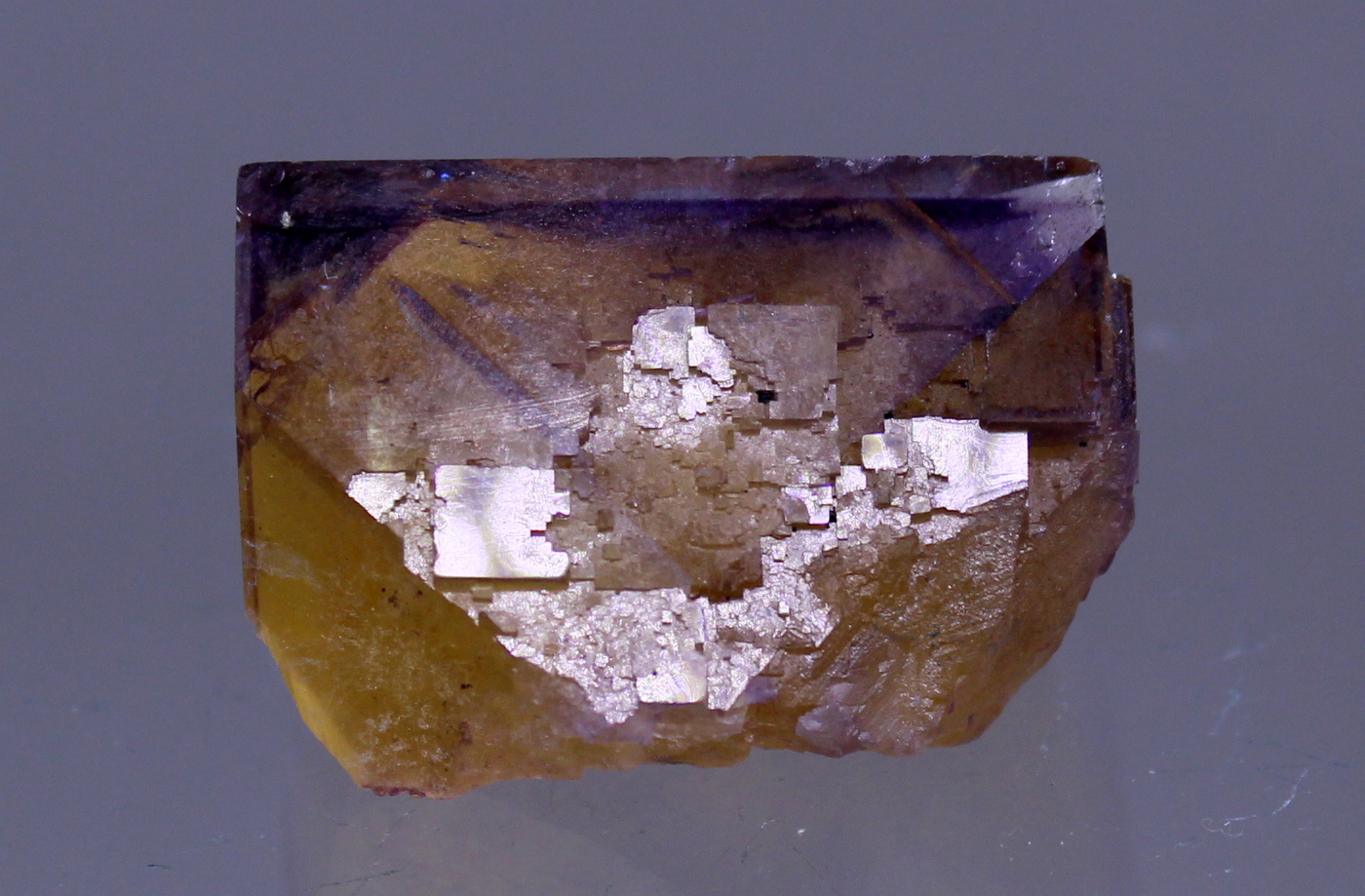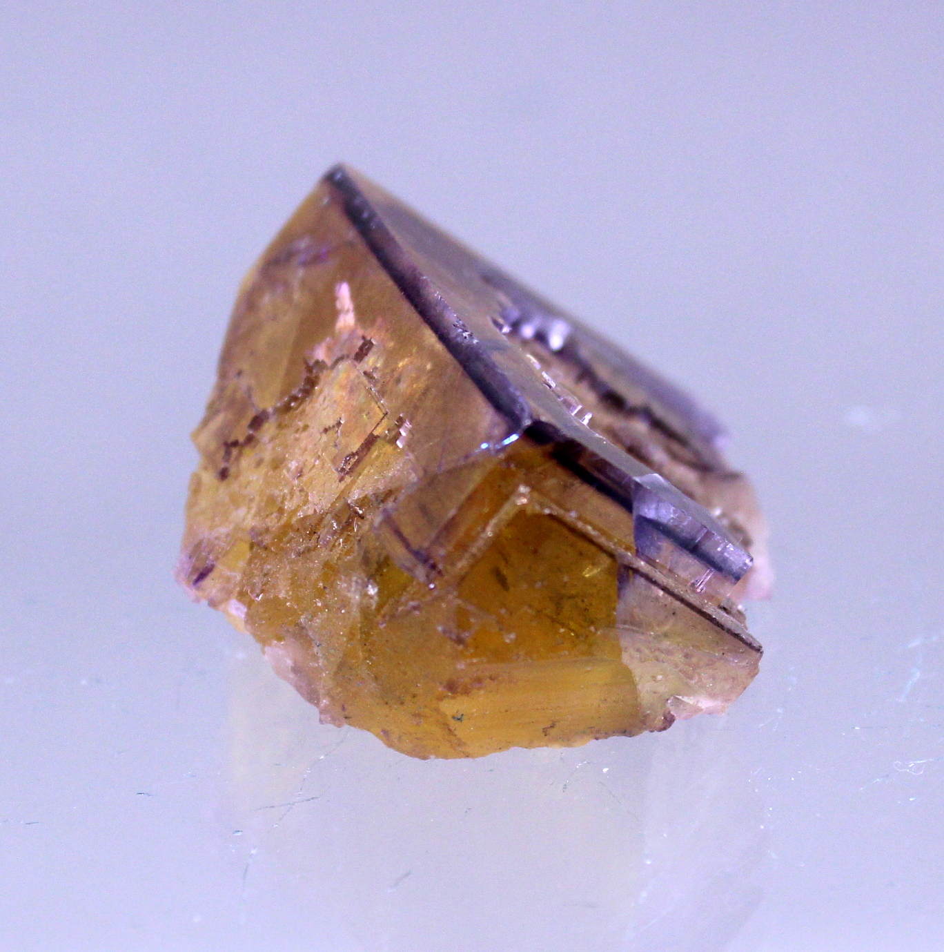 A yellow cubic Fluorite with purple zoning and glassy luster. A myriad of internal fractures add a distinctive quality. If that is a distraction a quick vacuum seal will eliminate them.
