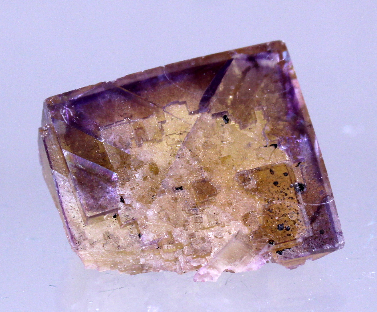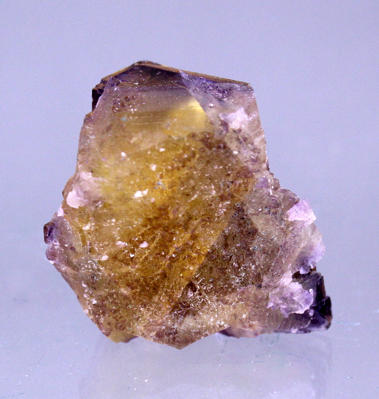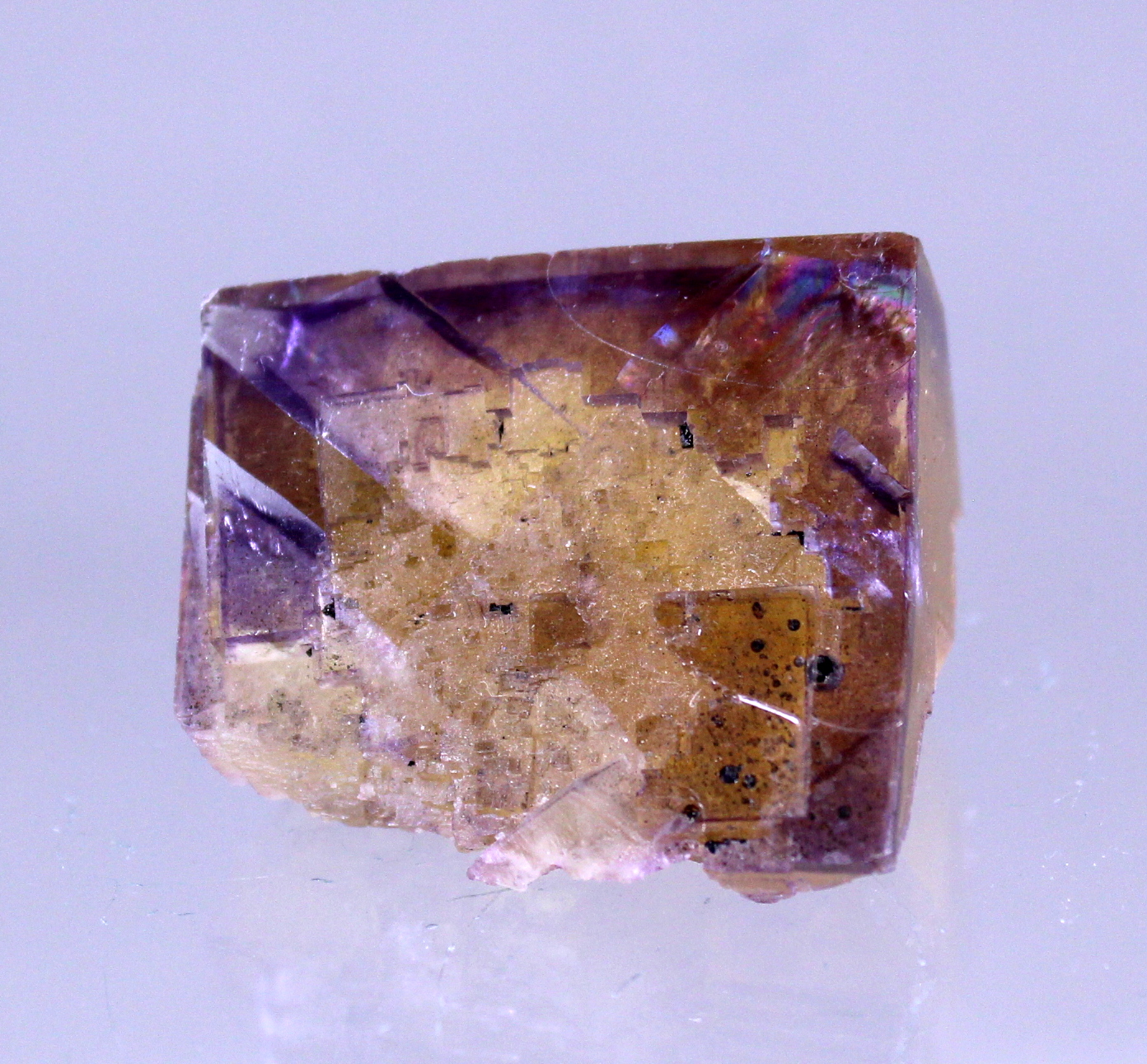 A yellow cubic Fluorite with purple zoning and glassy luster. A myriad of internal fractures add a distinctive quality. If that is a distraction a quick vacuum seal will eliminate them.