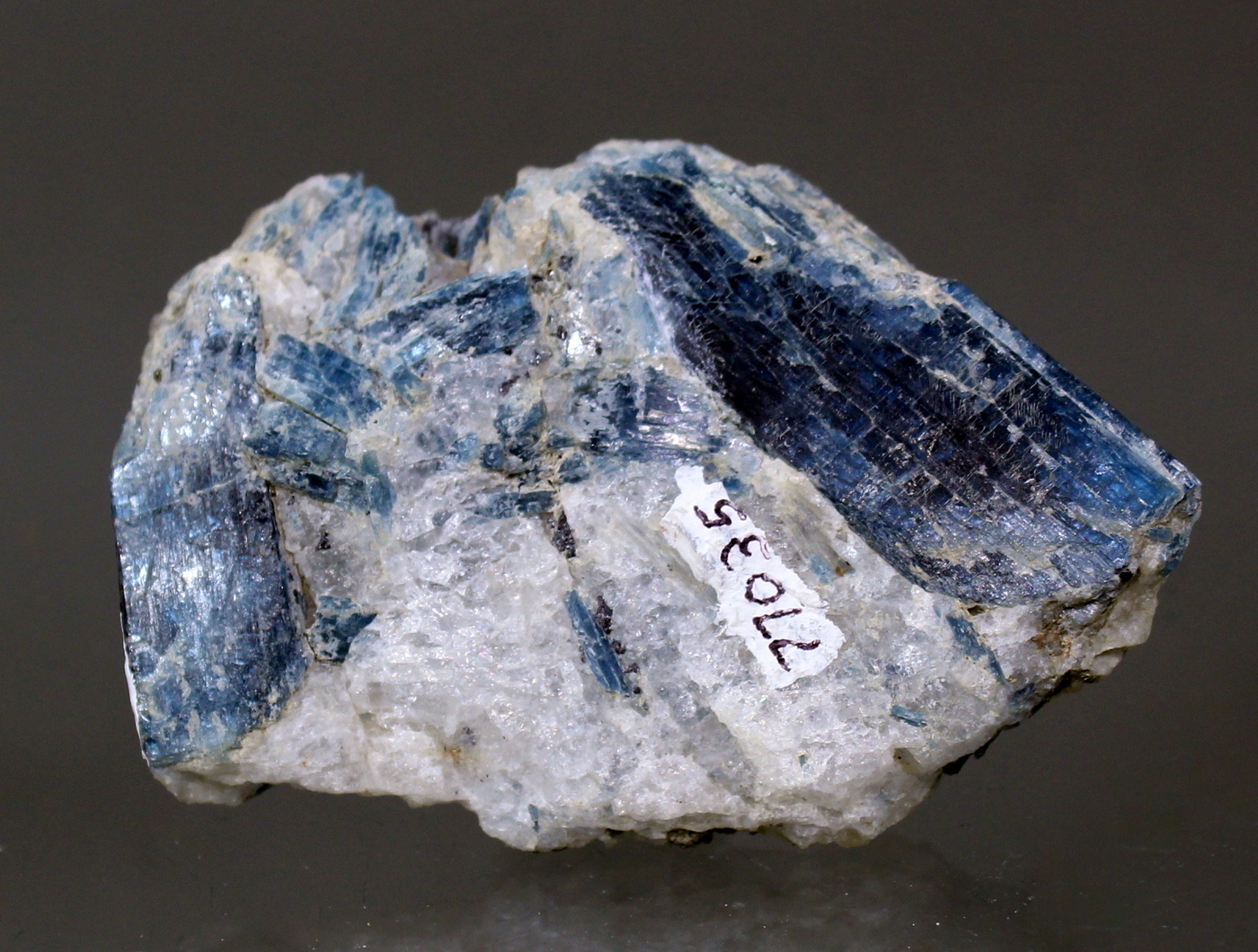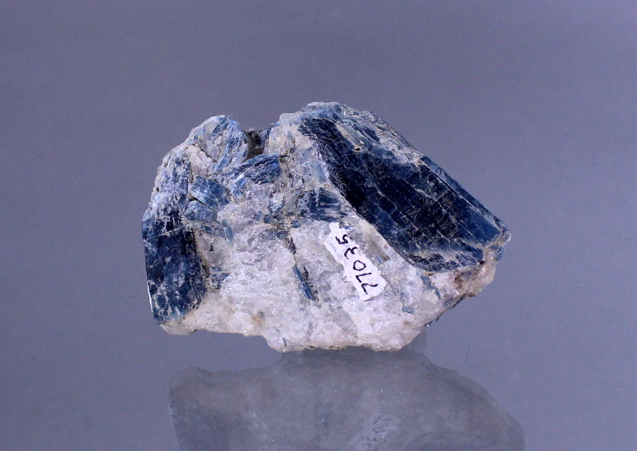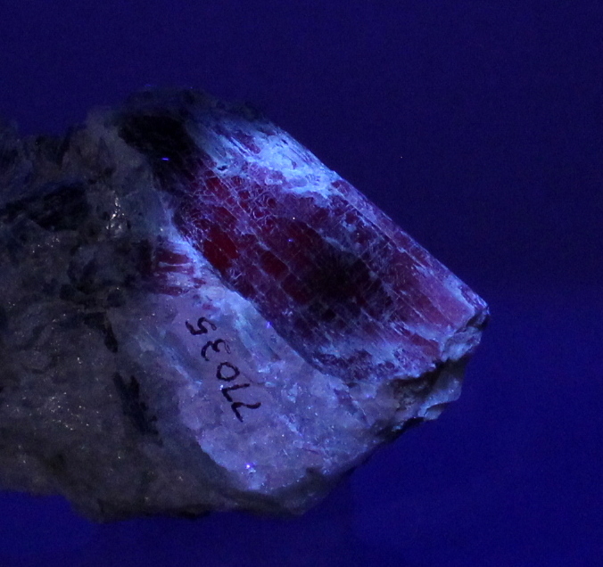 This specimen consists of blades to 4.7cm with a rich deep blue color. It fluoresces bright red under LW. It was found in 1977 by Al Bullock. Ex George Loud.
