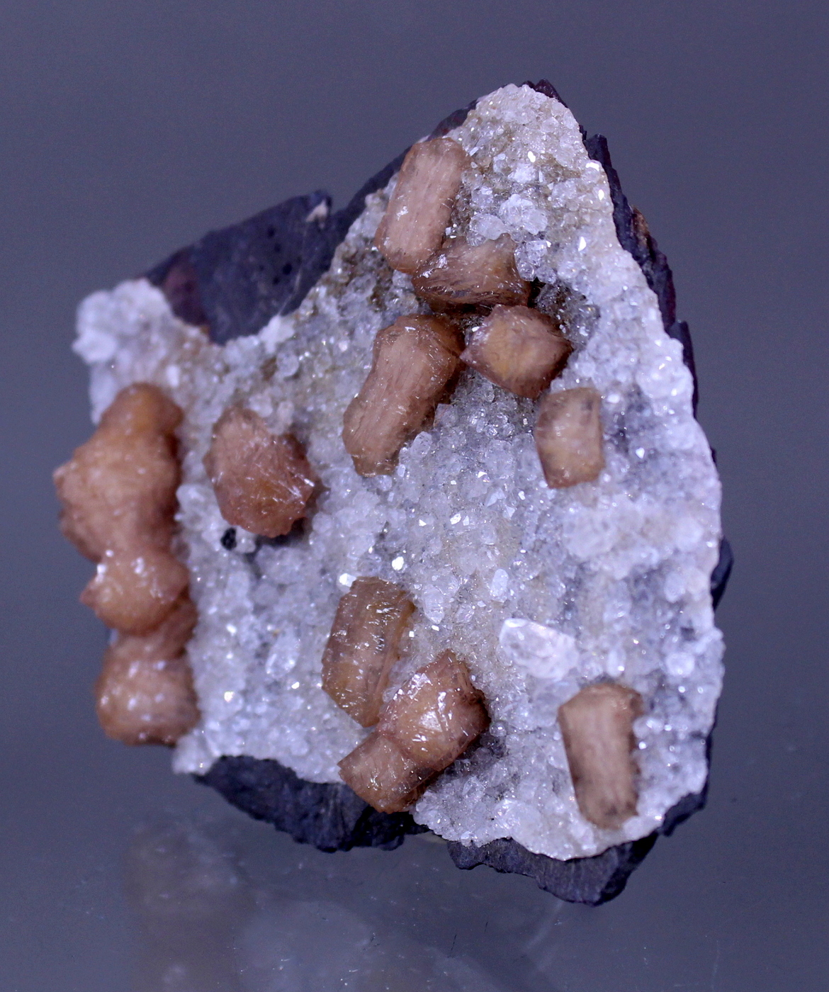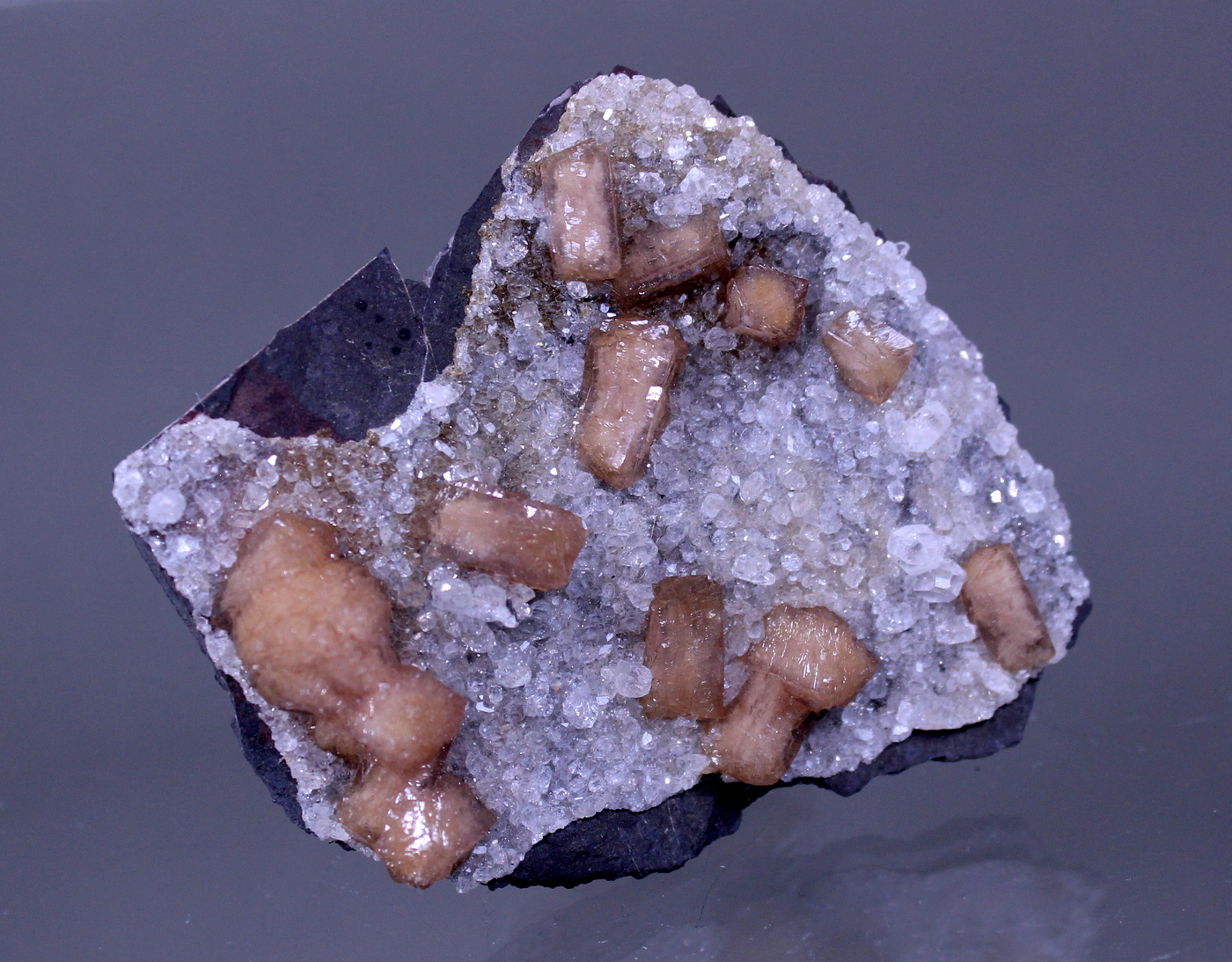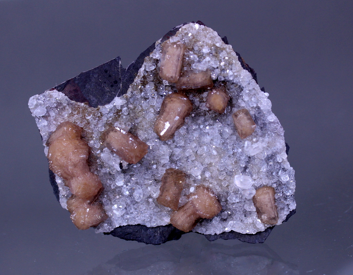 A thin plate of hematite matrix hosts a coating of sparkling clear calcites on which we find over a dozen fine gemmy salmon colored Olmiites. Fluorescent deep red under SW. I love the isolation. Discovered around 2003 and no longer being found. Ex Phillip Potter