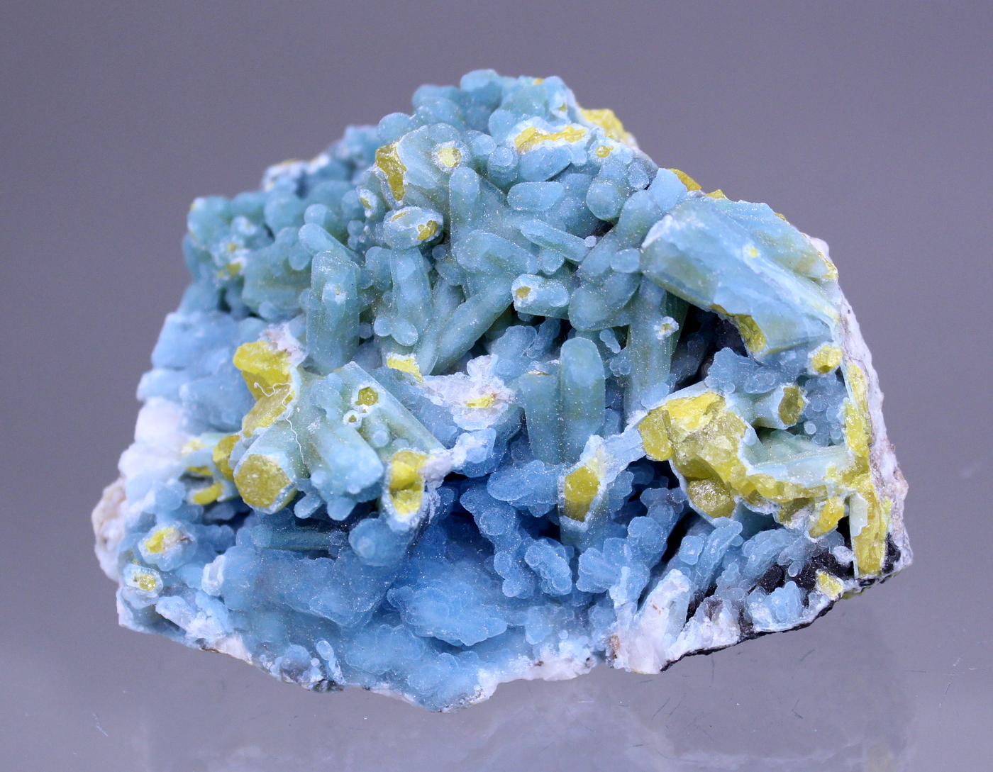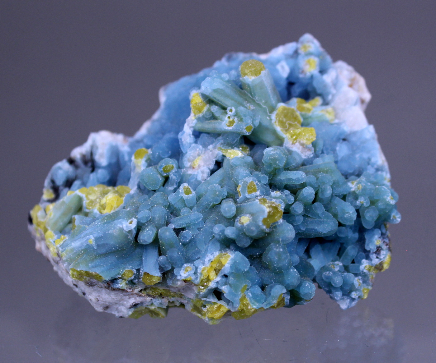 These specimens surfaced about 15 years ago and were all the rage. Some were pseudomorphs and others, like this one, were a coating of Plumbogummite over fully realized Pyromorphites. The broken crystals help reveal the bright yellow Pyromorphites and adds wonderful color contrast.