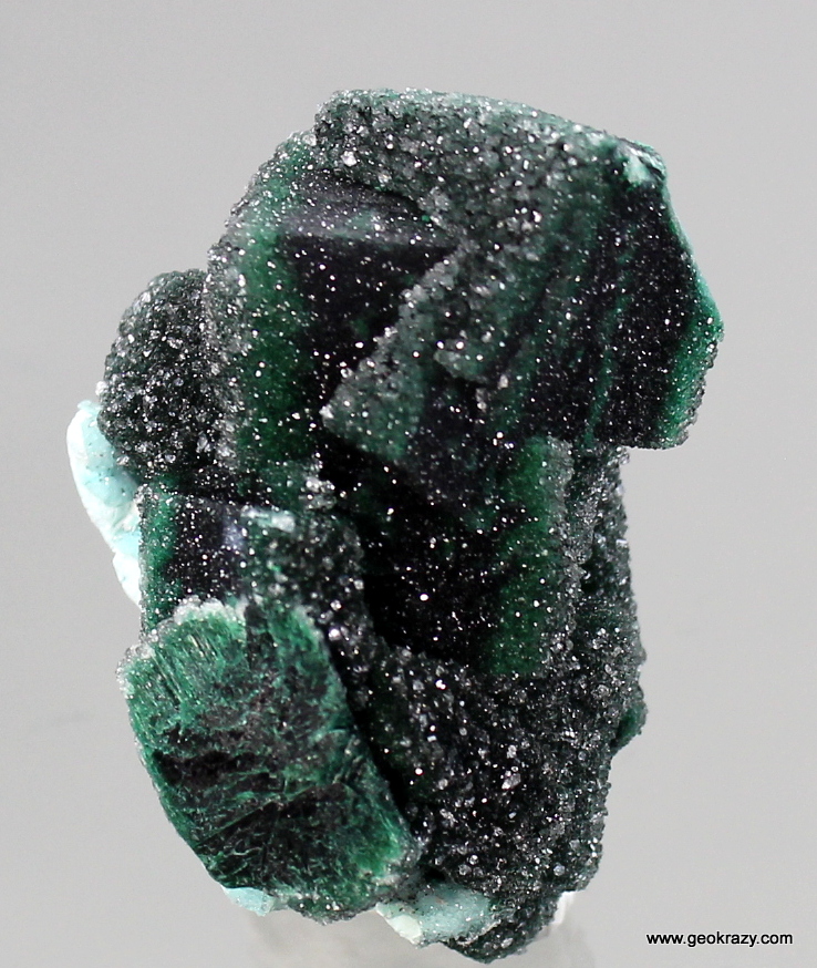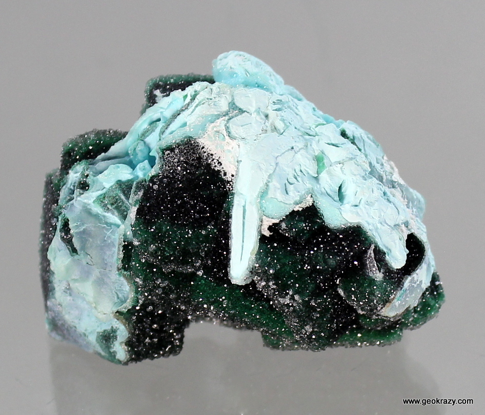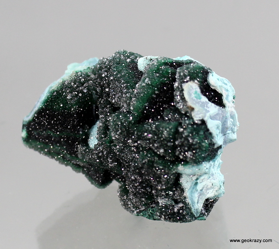 As I was hunting through a large lot of chrysocolla and malachite I came across this one specimen that immediately rung my bell. A mound of primary malachite crystals as large as 2cm wrapped with veins of chrysocolla.