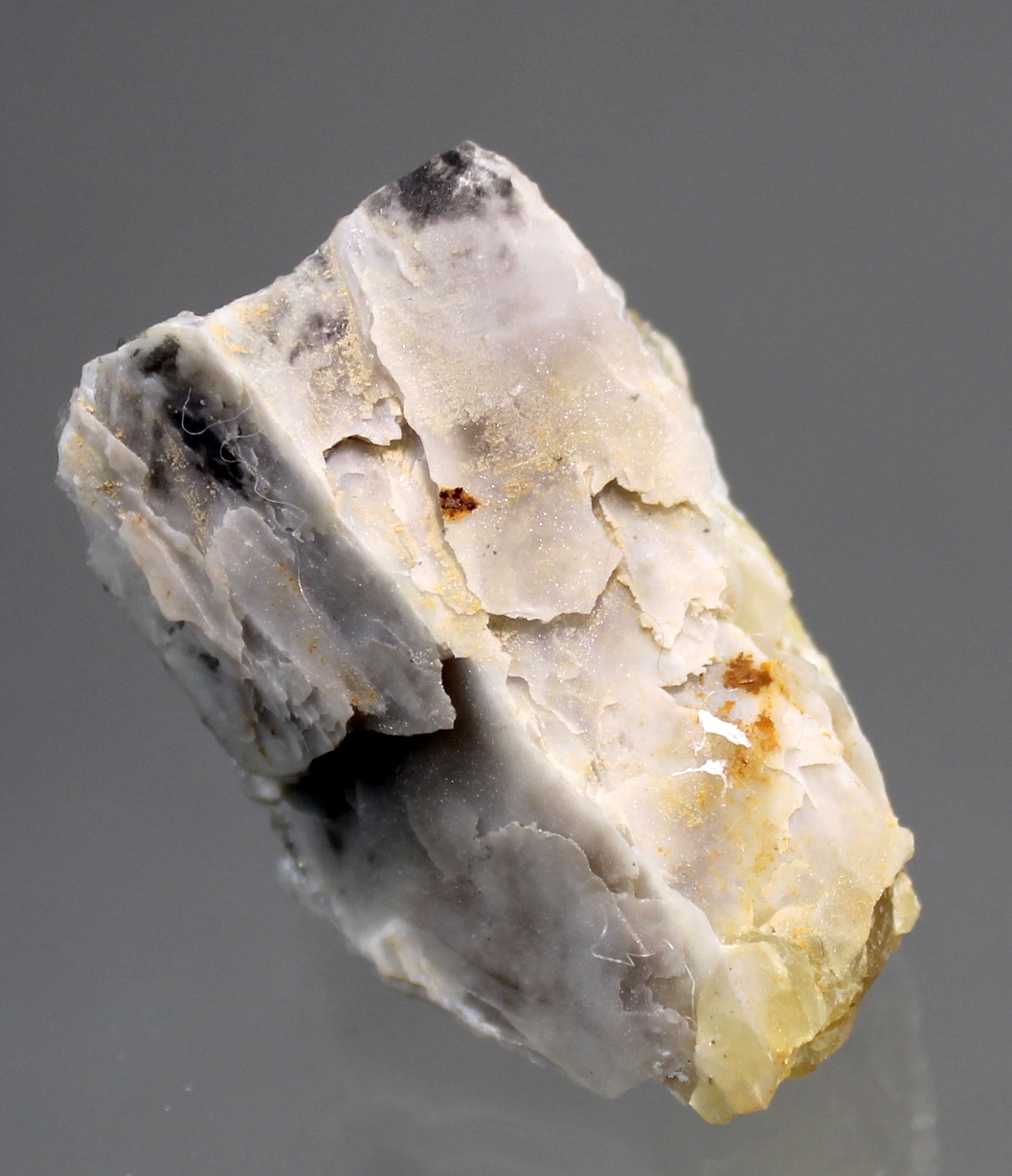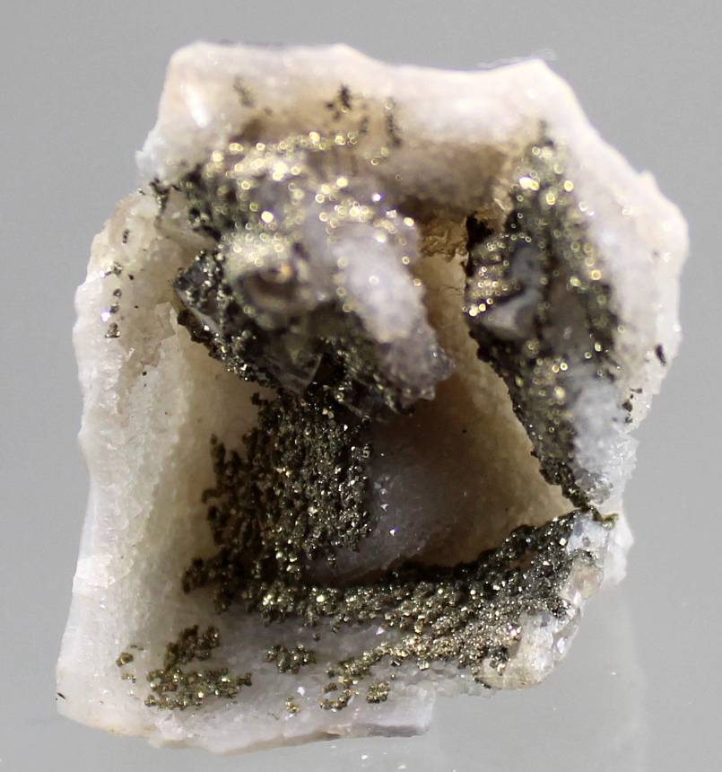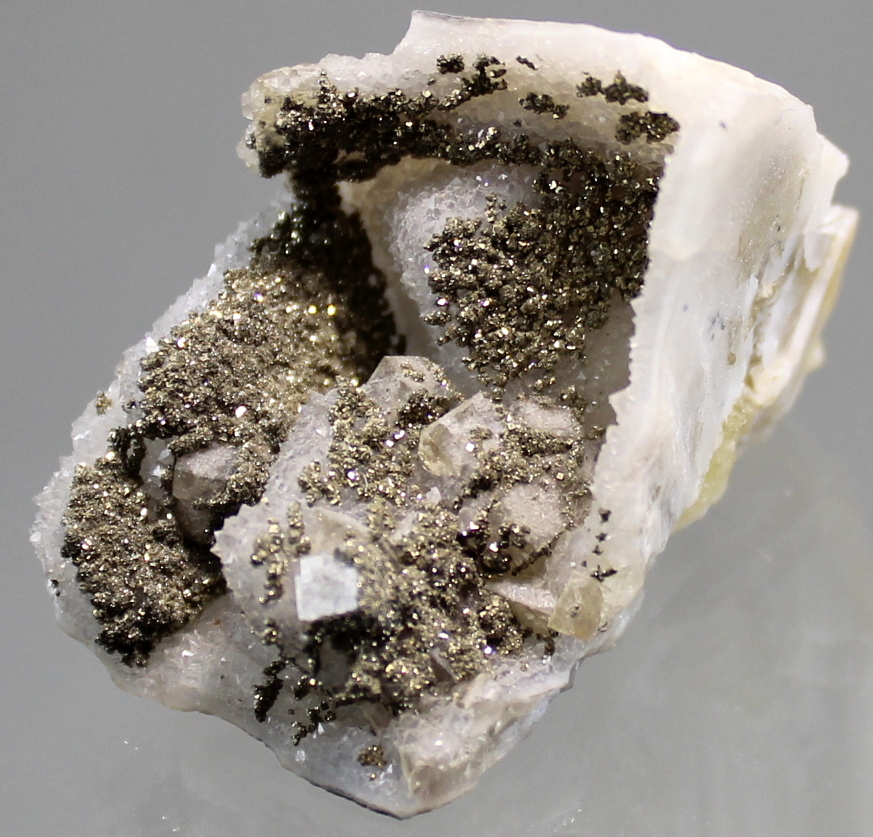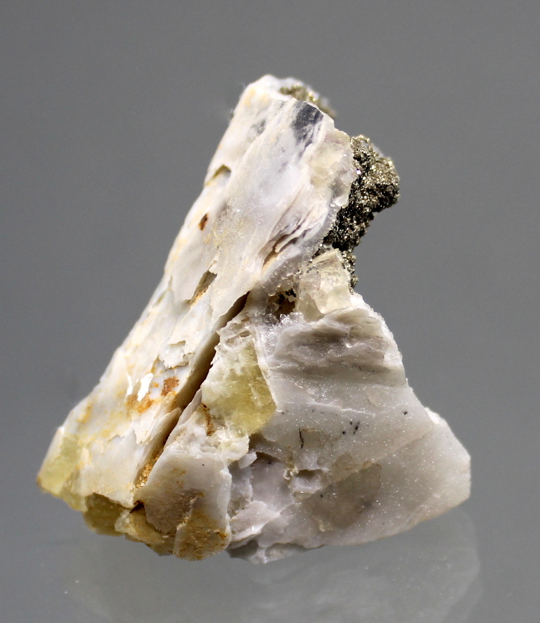A rather interesting piece where the quartz cast formed in layers over what I believe to have been calcites. At the termination is fluorite, which appears to incorporate itself, so the paragenesis is not clear to me. The sprinkling of pyrites only on the inside indicate it detached and the pyrites formed last.