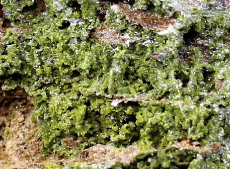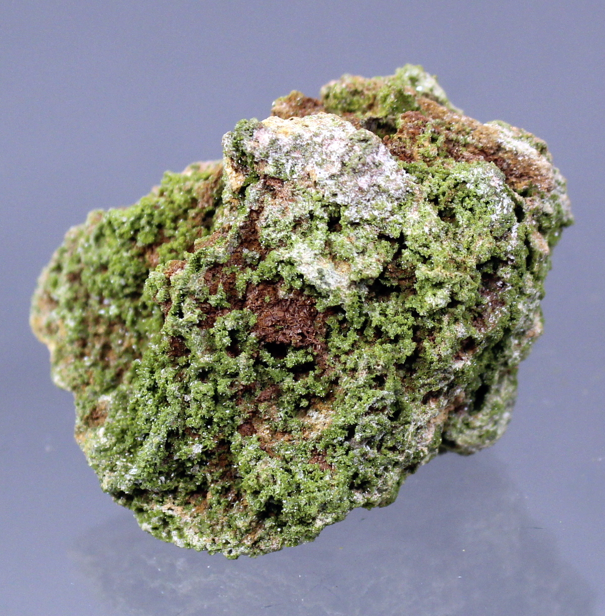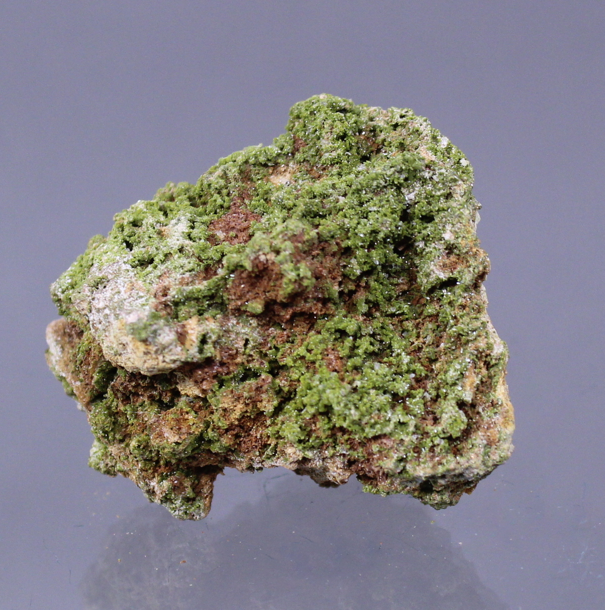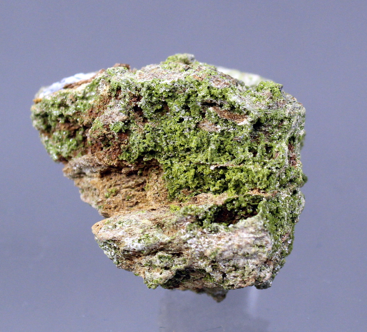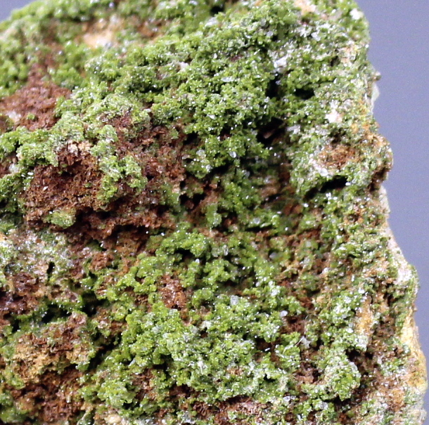 A vuggy piece of breccia coated with green pyromorphites. The label tells me there is a wulfenite somewhere but I sure as heck cant find it. Collected by Michael Dunn in 2007. Ex George Loud