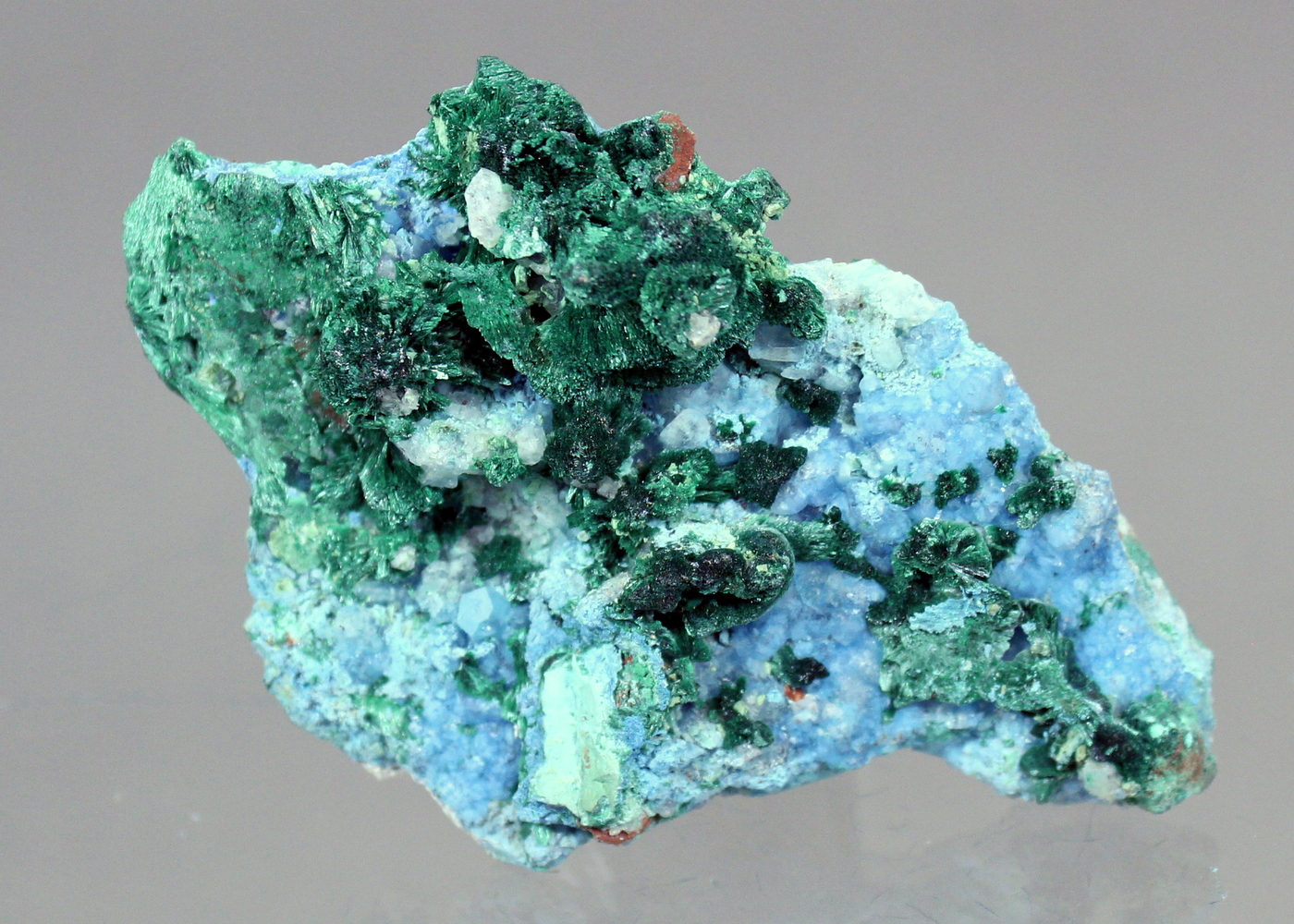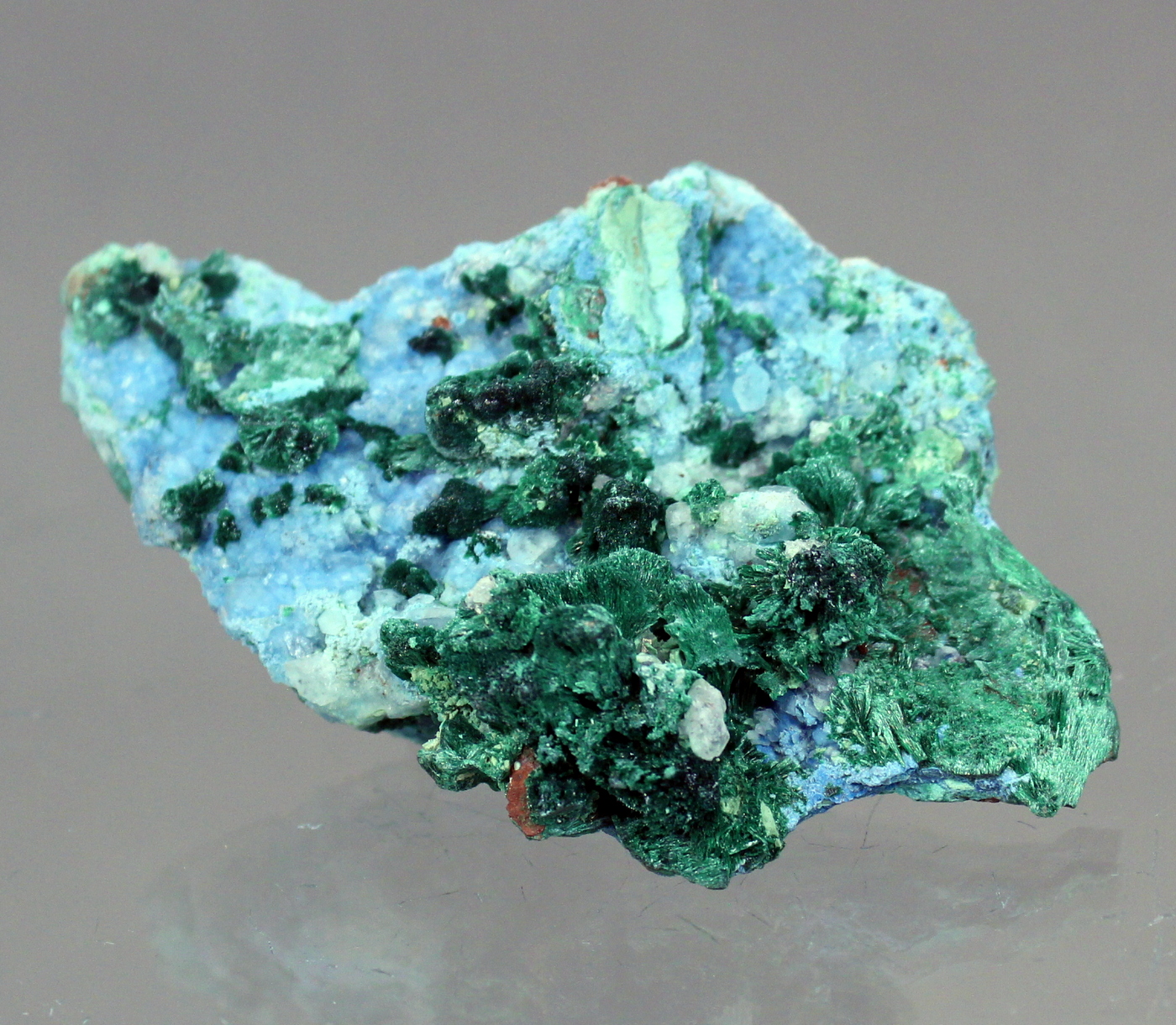 A gorgeous plate of forest green malachite contrasted by robins egg blue Shattuckite with minor quartz. The Milpillas Mine is contemporary but production of certain copper secondaries was limited and plates like this one less common. Great price!