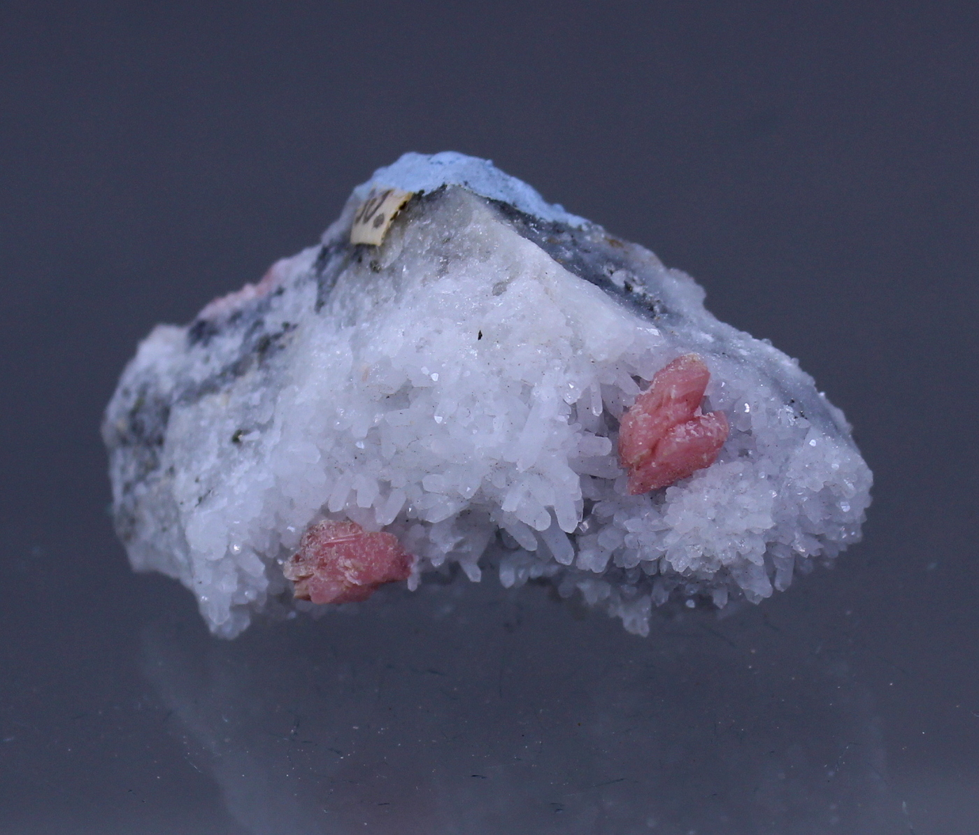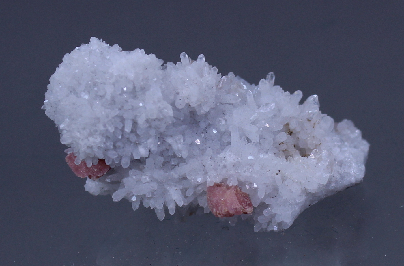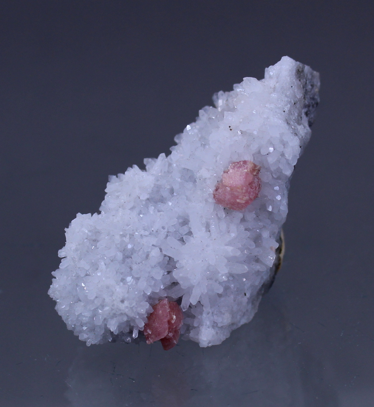 A classic miniature with three pink rhombohedral Rhodochrosites nested amongst a small foreat of opaque Quartz.