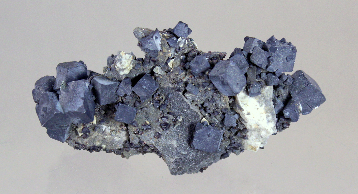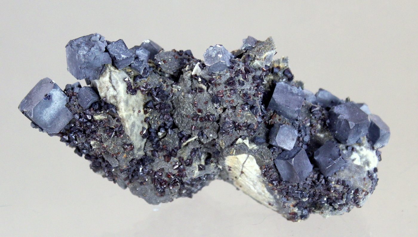 A fine tri-state specimen wiyth a chert matrix hosting dozens of pewter colored galena cubes to 1cm which are surrounded by small ruby jack. Ex Jim and Paula Wilson