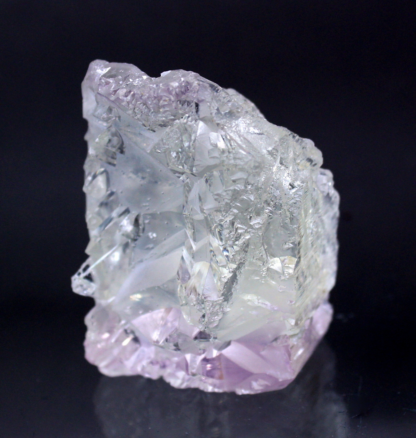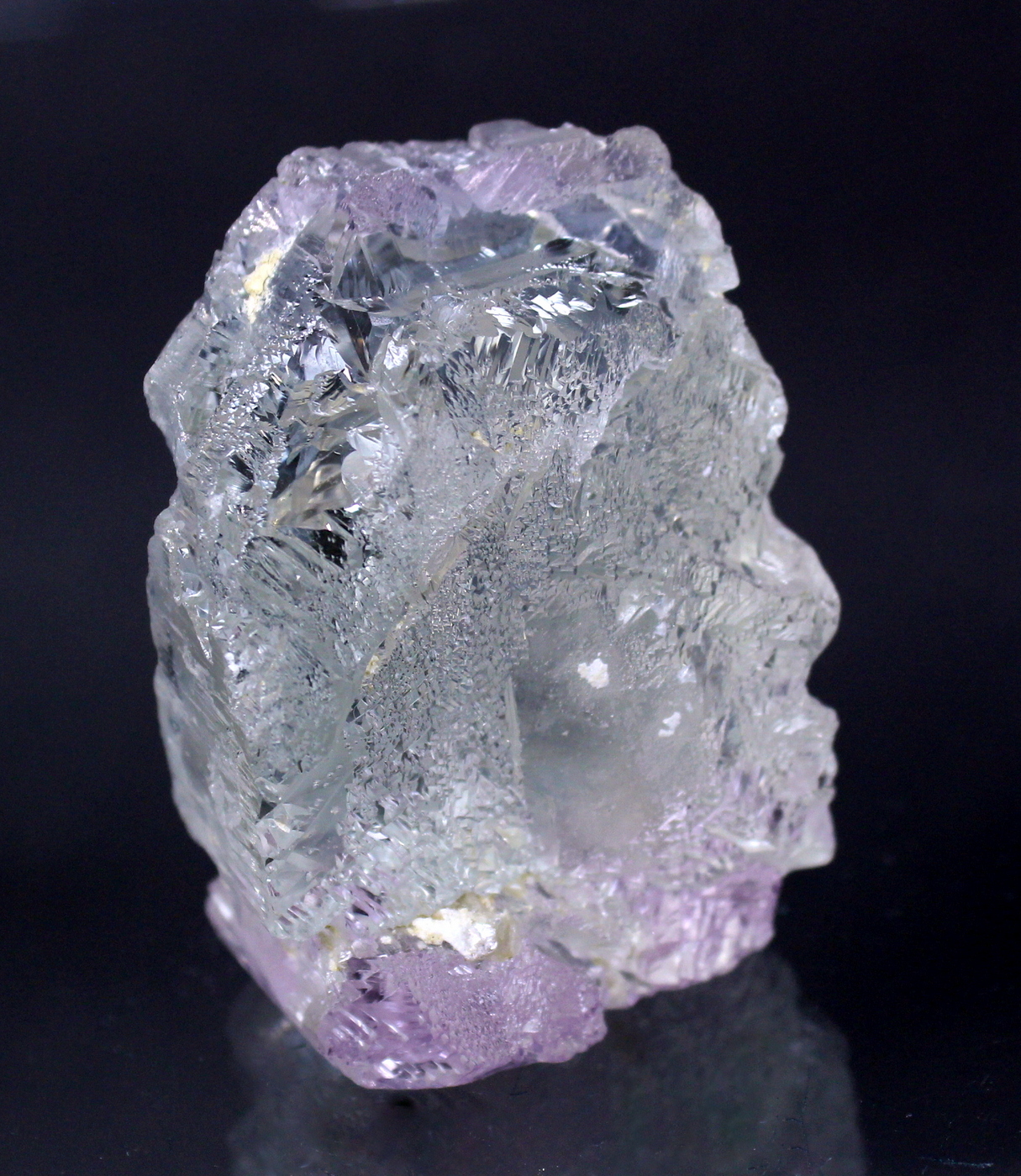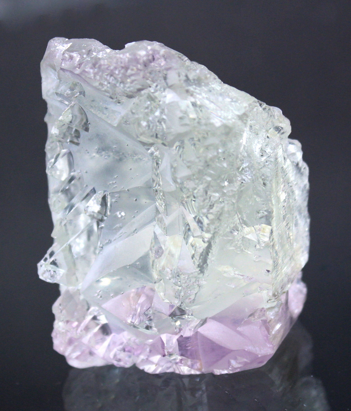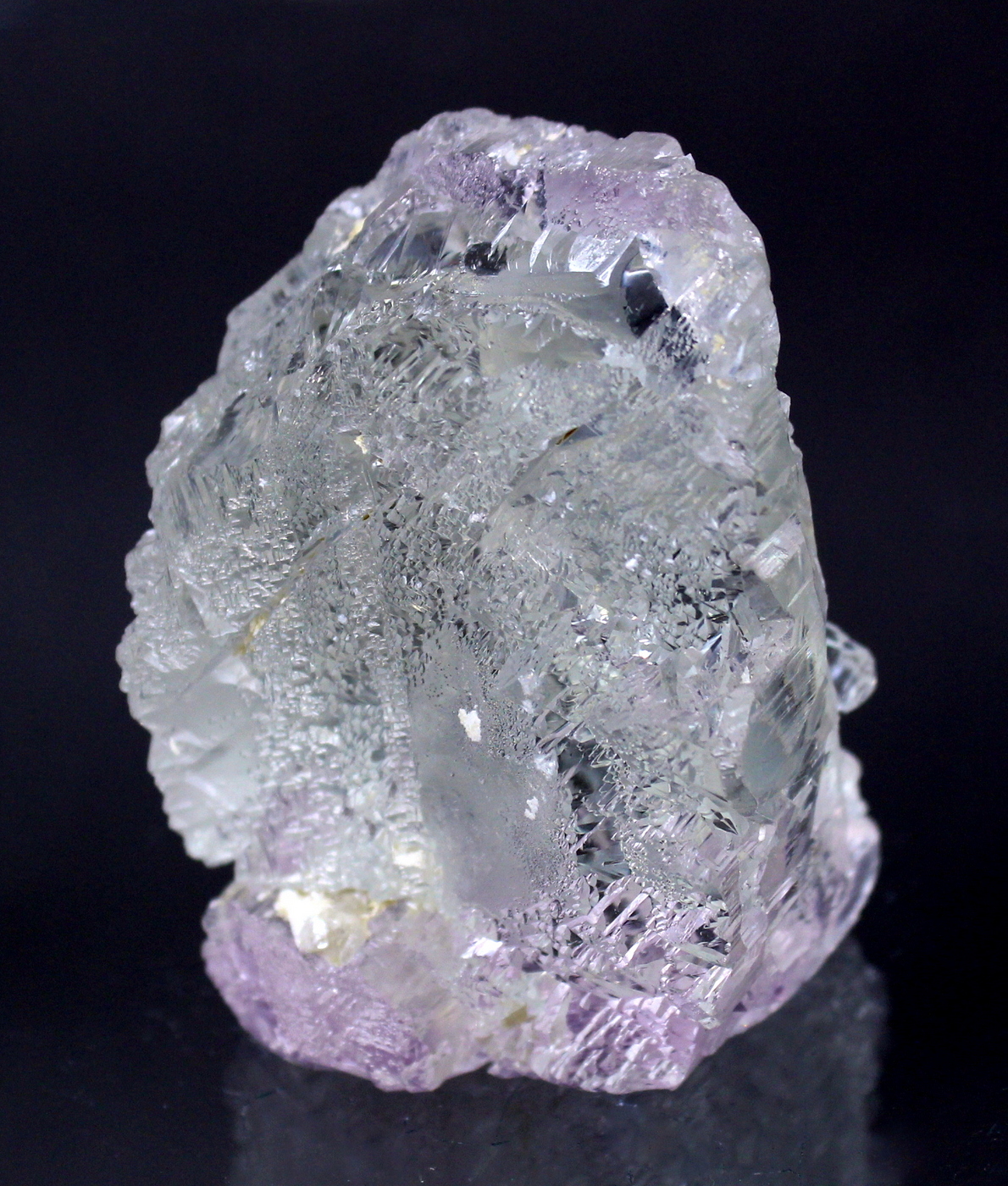 WOW. This floater crystal is totally sculpted. The complex faces are haphazard and vary around the specimen. The lilac color reveals itself at the very top and bottom of the specimen. No damage. A prize in any collection. Ex Phillip Potter